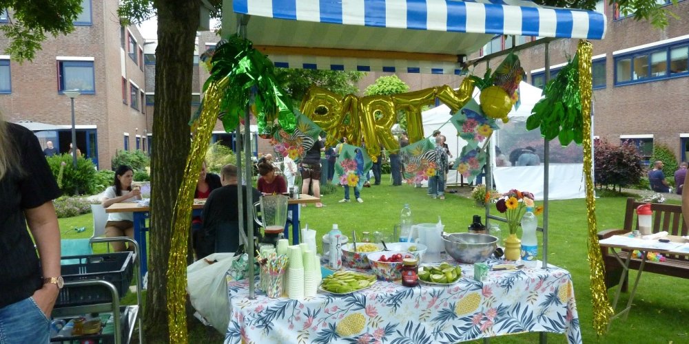 Het is dinsdag, 9 uur, en onze kunstvakdocenten zijn al druk in de weer om alles op poten te zetten. Tussen het groen van de tuin staan er kleurrijke kraampjes klaar, tie dye-tafels, pottenbakkersschijven, een mocktailbar en podium voor de muzikanten en dichters. Patiënten en medewerkers van de kliniek en de A-vleugel leren van elkaar didgeridoo spelen, sleutelhangers maken, drankjes mixen... waarbij de jazzband van medewerker Ad de dag afsluit.