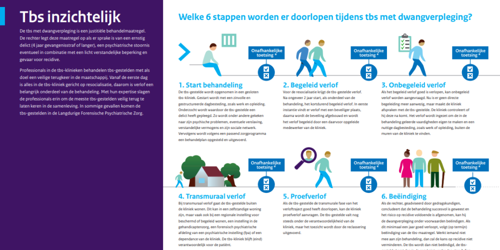 Dienst Justitiële Inrichtingen (DJI) heeft de Infographic tbs geactualiseerd. Met handige uitleg over de behandeling, verlof en kerngetallen over tbs. De gegevens zijn gebaseerd op cijfers uit 2023.