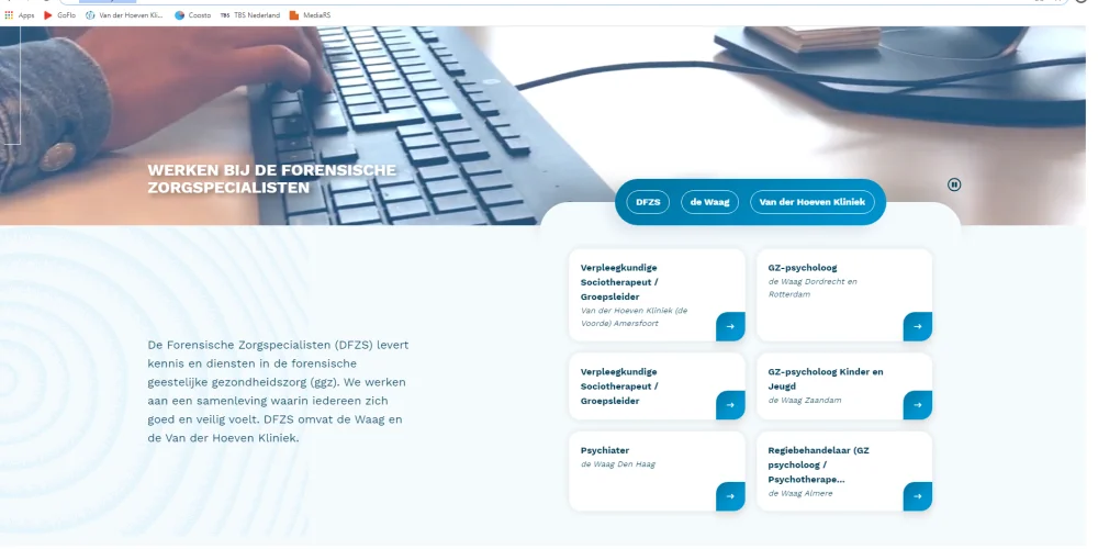 Vandaag is onze totaal vernieuwde website voor Werken bij DFZS live gegaan! En wat zijn we blij met het resultaat. Naast dat de inhoud en het uiterlijk helemaal veranderd is, hebben we het ook makkelijker gemaakt om op de hoogte te blijven van de laatste nieuwe vacatures van De Forensische Zorgspecialisten, de Waag en de Van der Hoeven Kliniek.